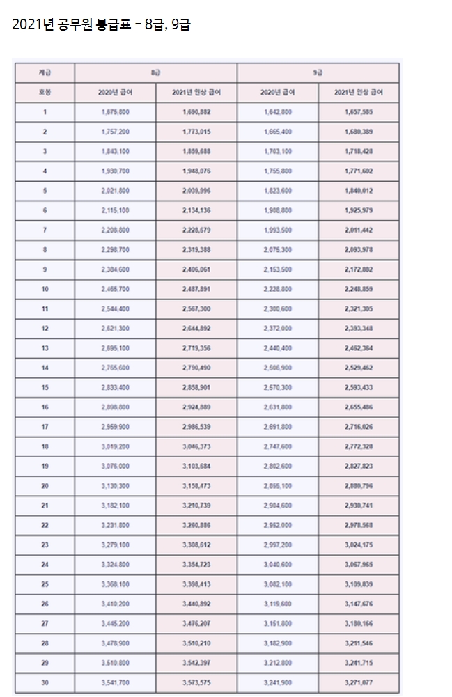 다가오는 2021년 신축년에는 공무원 봉급이 2020년보다 0.9% 인상됩니다. 이 공무원 임금 인상률이 반영된 2021년 공무원 봉급표를 첨부해드리겠습니다. 아지기 2021년 공무원 봉급표 및 인상률 확인을 하지 못하신 분들이 계신다면 확인하시는게 좋을 것 같습니다.