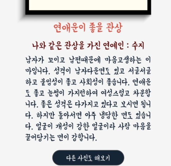 또한 이마와 볼, 눈, 코, 인중, 턱 등 얼굴 각 부위별 관상에 대한 설명과 나와 같은 관상을 가진 스타도 알려줍니다.