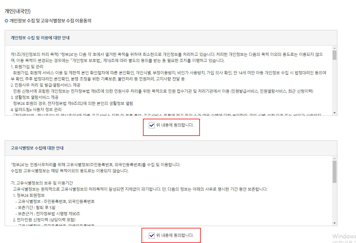 개인정보 수집 및 이용에 대한 안내와 고유식별정보 수집에 대한 안내에 대한 동의 버튼을 클릭합니다.