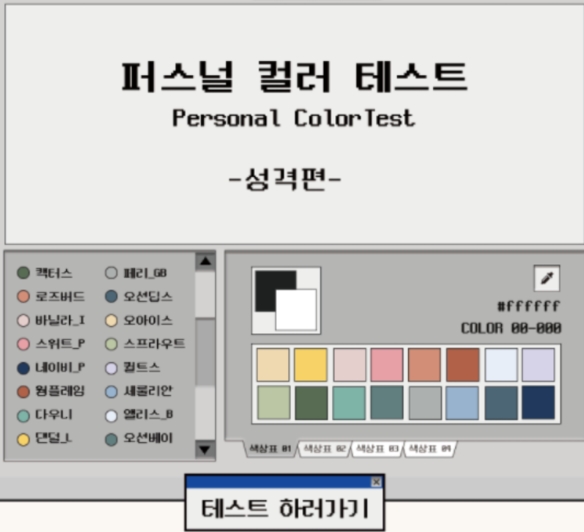 퍼스널컬러 케이테스트는 어떤 사람의 심리를 테스트해서 색채심리치료나 범죄 수사 용의자의 심리상태를 분석하는 진단입니다. 나오는 문제는 처음 보는 친구들에게 나는?, 주말에 난?, 거절해야 하는 상황이 오면 나는? 등이다. 두 가지 선택지 중에서 하나를 선택하면 다음 문제로 넘어갑니다.