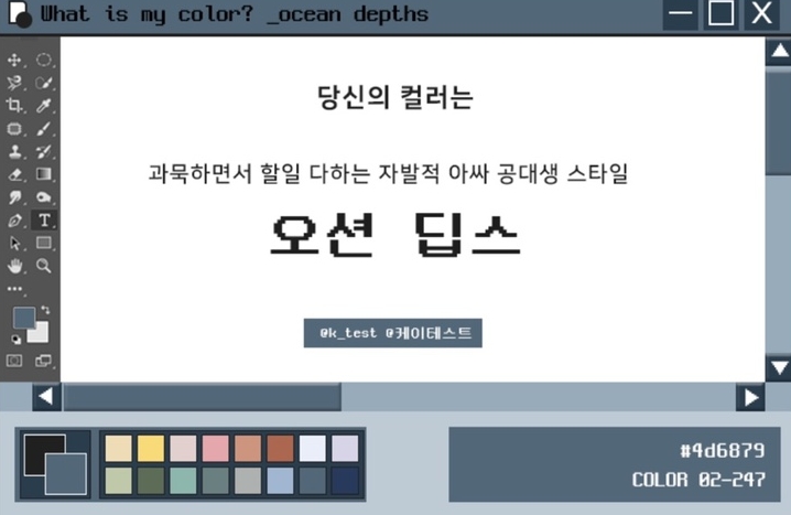 케이테스트 모든 질문에 답을 하면 로즈버드, 오션딥스, 다우니, 오션베이, 바닐라 아이스 등 총 16개 가운데 자신에게 맞는 한 개의 퍼스널컬러와 이에 대한 설명을 확인할 수 있습니다.